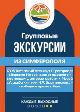 Обязательно: Головные уборы, средства защиты от солнца. С собой иметь перекус, воду, личную аптечку. В Ялте свободное время, посещение кафе ПОСЛЕ ОКОНЧАНИЯ ПРОГРАММЫ.